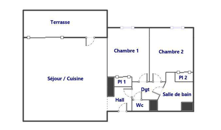 Le logement se compose d'un séjour avec cuisine ouverte, offrant un espace de vie convivial et fonctionnel. Vous disposerez de deux chambres, d'une salle de bain ainsi que de WC séparés.