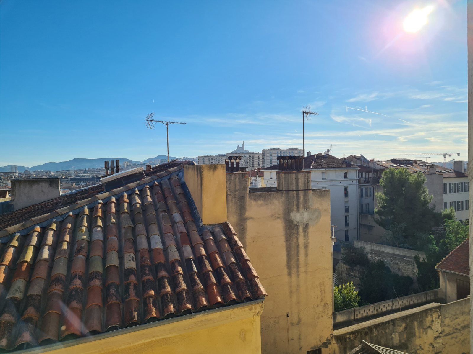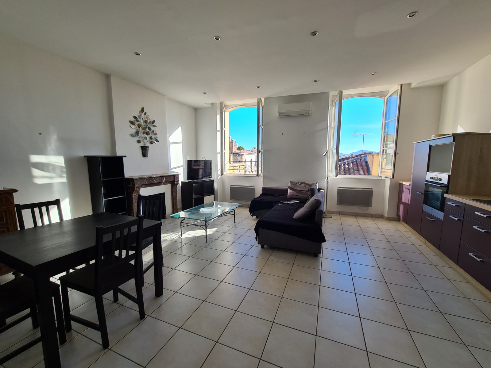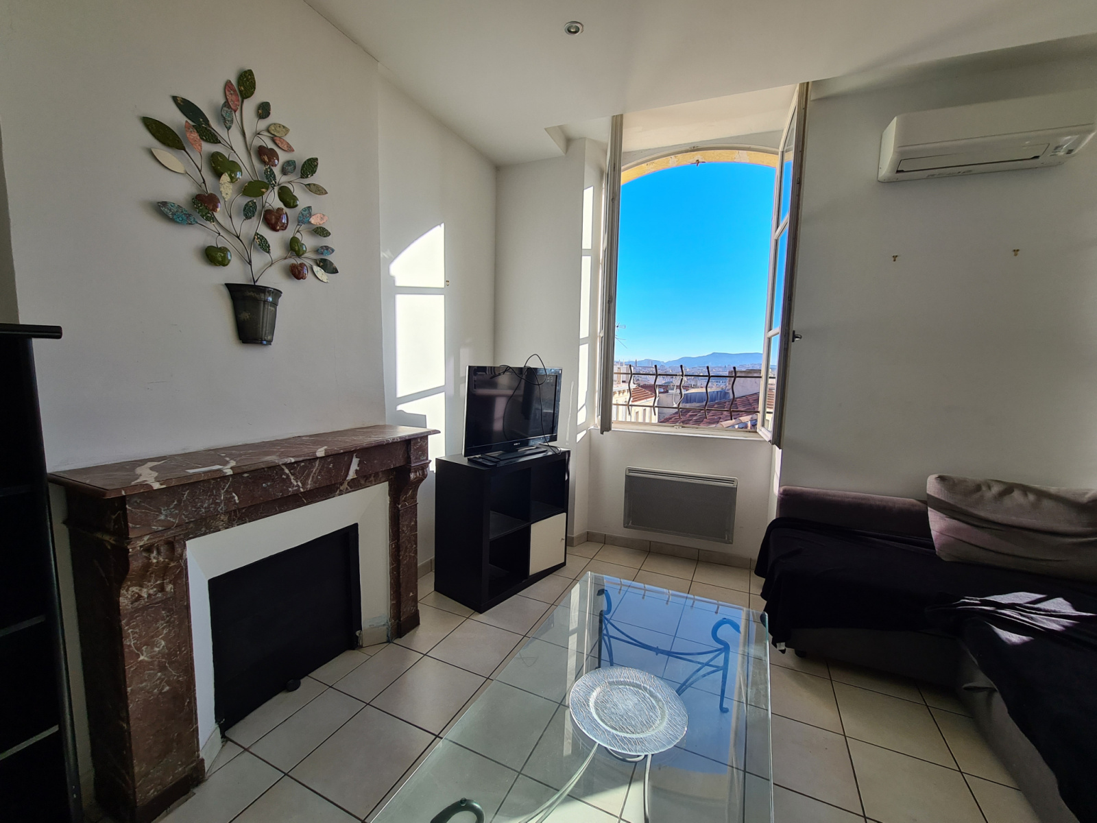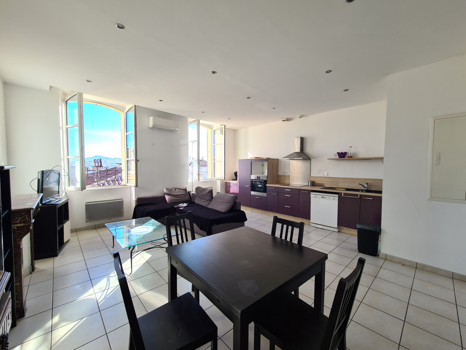 Le salon-séjour avec cuisine ouverte d’environ 31 m2 exposé SUD possède une superbe vue dégagée et sans vis-à-vis sur la ville et Notre Dame de la Garde.