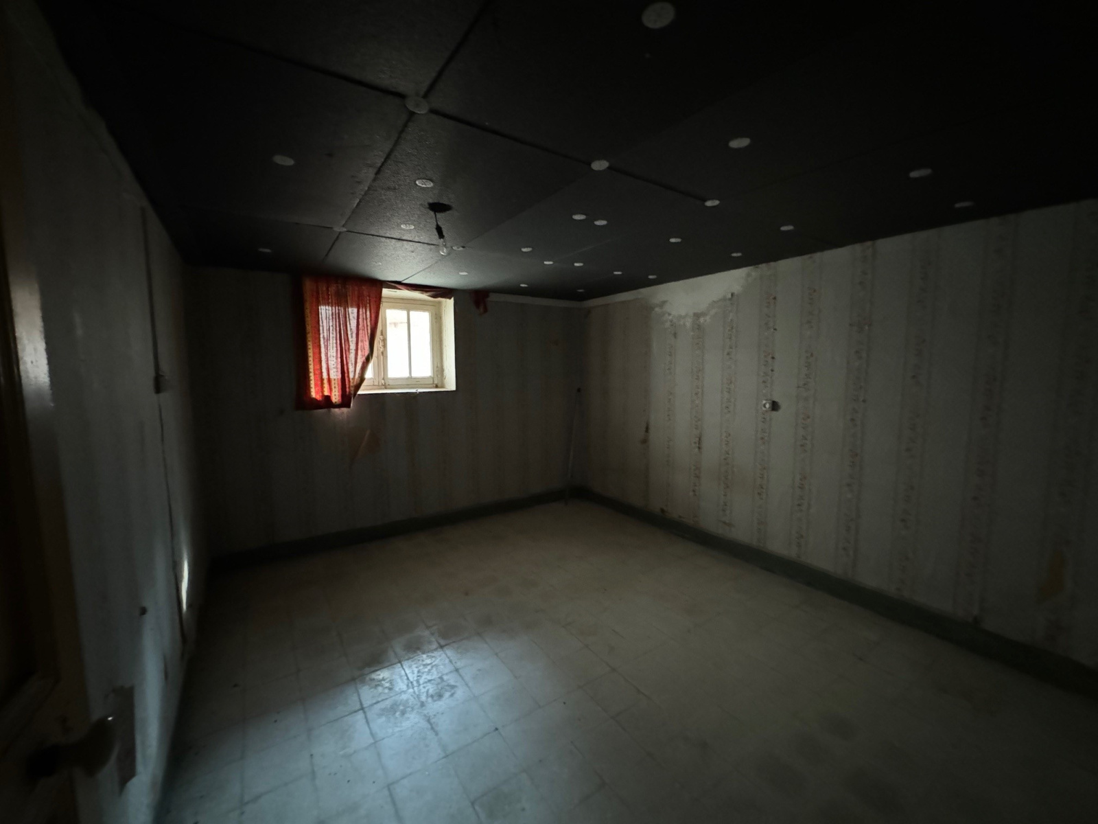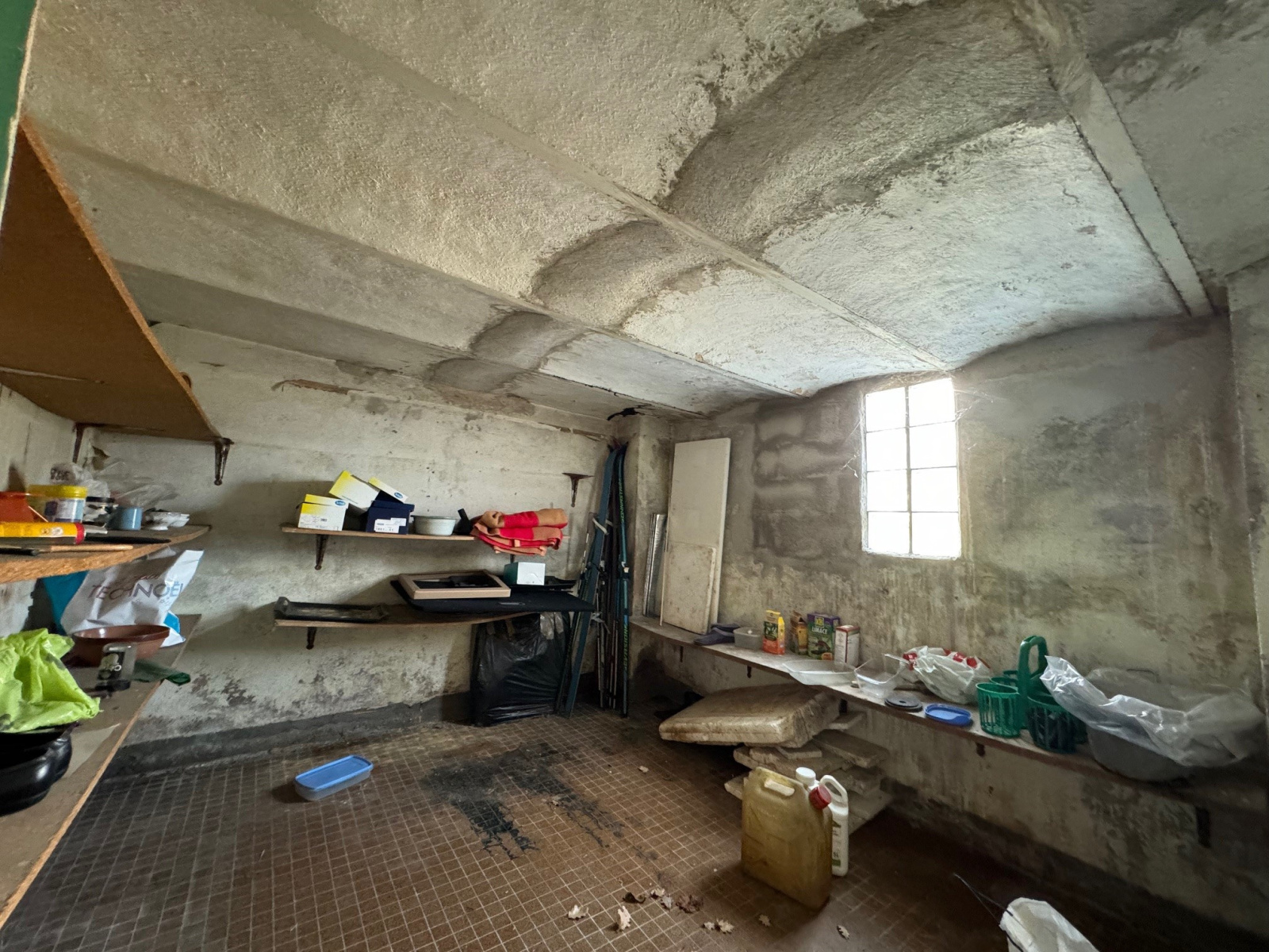 au rdc de la maison ( 80 m² environ ) qui necessite une renovation intégrale se trouve 3 pieces ainsi qu' une cave et une piece de stockage.